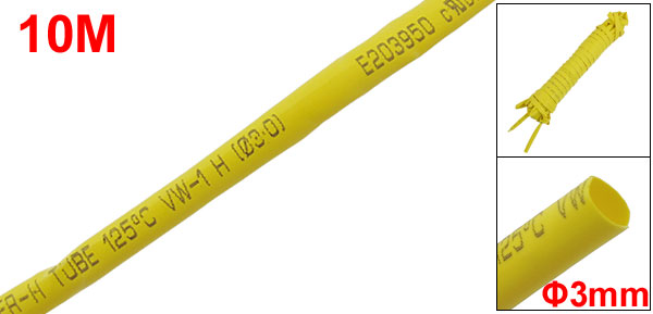 Ratio 2:1 3mm Dia Yellow Polyolefin Heat Shrinkable Tube 10M 32.8Ft