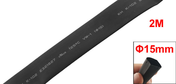 DetailsRatio 2:1 Black Polyolefin 15mm Dia Heat Shrink Shrinkable Tube 2M  Product Name Heat Shrinkable Tube Material Polyolefin Rated Voltage 600V Temperature Level 125 Celsius Degree Flammability VW-1 Diameter 15mm / 0.6" (Before Shrinking) 7.5mm / 0.3" (After Shrinking) Shrink Ratio 2:1 Length (Approx.) 2M / 6.6Ft Color Black Weight 41g Package Content 1 x Heat Shrinkable Tube