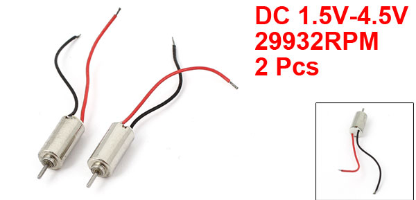 Product Name Coreless Motor Rated Voltage DC 1.5-4.5V Speed 29932RPM Body Size 4 x 8mm / 0.16" x 0.31" (D*H) Wire Length 25cm / 0.1" Total Length 35mm/ 1.4" Main Color Silver Tone Material Metal Weight 2g Package 2 x DC Coreless Motor - Reviews