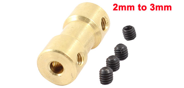 Product Name Motor Shaft Coupling Type(Inner Hole Dia) 2mm to 3mm/0.08" to 0.12" Total Size 2 x 0.9cm/0.79" x 0.35"(L*D) Thread Dia 2mm/0.08" Main Color Gold Tone Material Brass Weight 5g Package Content 1 x Motor Shaft Coupling