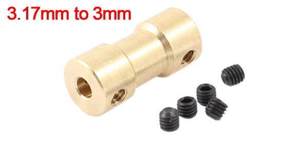 Product Name Motor Shaft Coupling Type(Inner Hole Dia) 3.17mm to 3mm/0.125" to 0.12" Total Size 2 x 0.9cm/0.79" x 0.35"(L*D) Thread Dia 2mm/0.08" Main Color Gold Tone55 Material Brass Weight 5g Package Content 1 x Motor Shaft Coupling