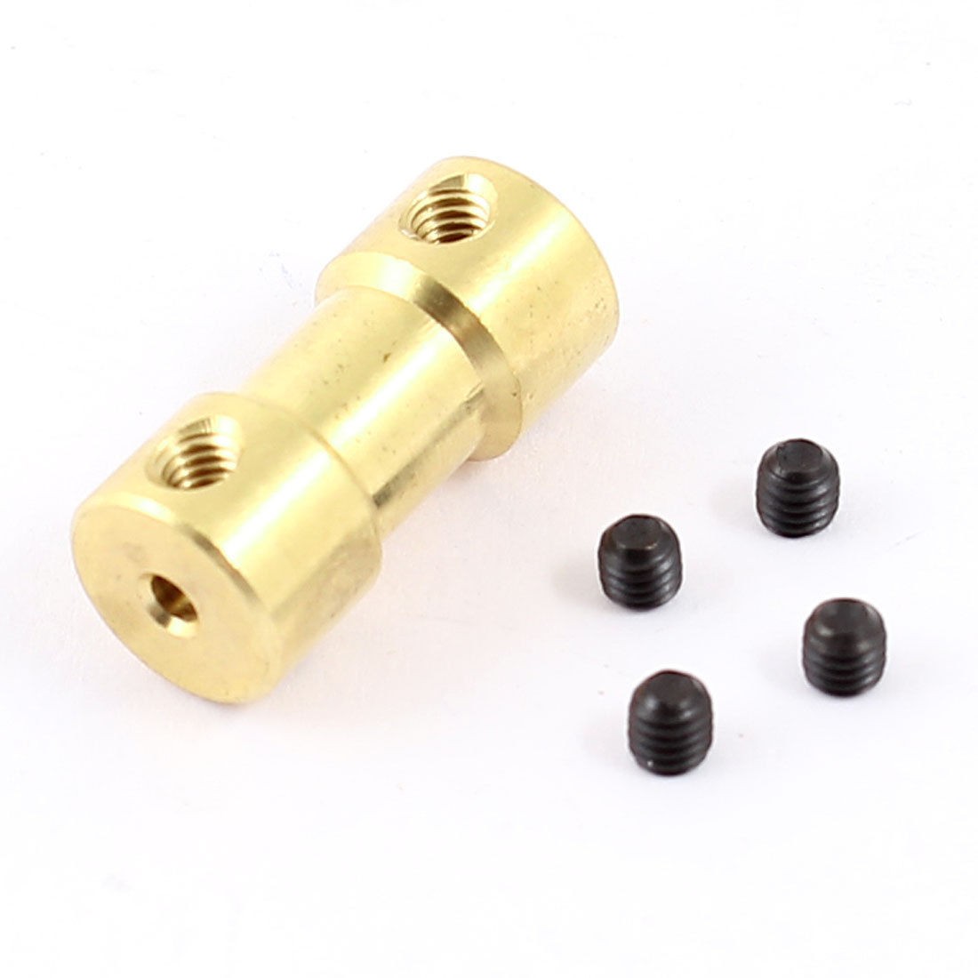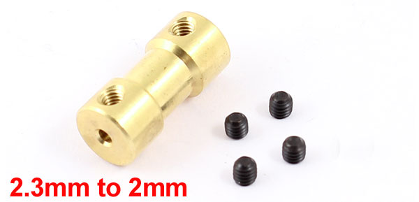Product Name Motor Shaft Coupling Type(Inner Hole Dia) 2.3mm to 2mm/0.09" to 0.08" Total Size 2 x 0.9cm/0.79" x 0.35"(L*D) Thread Dia 2mm/0.08" Main Color Gold Tone Material Brass Weight 5g Package Content 1 x Motor Shaft Coupling
