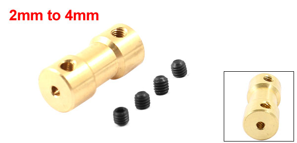 DetailsRC Airplane Helicopter 2mm to 4mm Brass Motor Shaft Coupling Coupler  Product Name Motor Shaft Coupling Type(Inner Hole Dia) 2mm to 4mm/0.08" to 0.16" Total Size 2 x 0.9cm/0.79" x 0.35"(L*D) Thread Dia 2mm/0.08" Main Color Gold Tone Material Brass Weight 5g Package Content 1 x Motor Shaft Coupling 4 x Install Screws