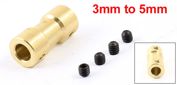 Product Name Motor Shaft Coupling Type(Inner Hole Dia) 3mm to 5mm/0.12" to 0.2" Total Size 2 x 0.9cm/0.79" x 0.35"(L*D) Thread Dia 2mm/0.08" Main Color Gold Tone Material Brass Weight 5g Package Content 1 x Motor Shaft Coupling