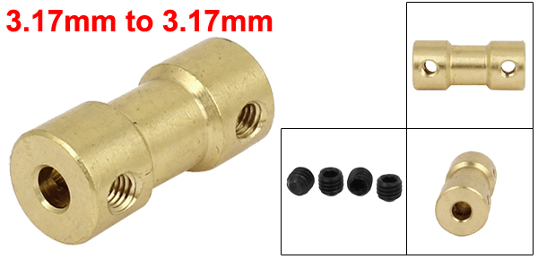 Product Name Motor Shaft Coupling Type 3.17mm to 3.17mm/0.12" to 0.12" Total Size 2 x 0.9cm/0.79" x 0.35"(L*D) Thread Dia 2mm/0.08" Main Color Gold Tone Material Brass Weight 5g Package Content 1 x Motor Shaft Coupling