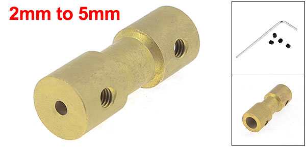 Product Name Motor Shaft Coupling Aperture Size 2mm x 5mm Total Size 2.5 x 0.9cm/1" x 0.35"(L*D) Main Color Gold Tone Material Metal, Plastic Weight 11g Package Content 1 x Motor Shaft Coupling