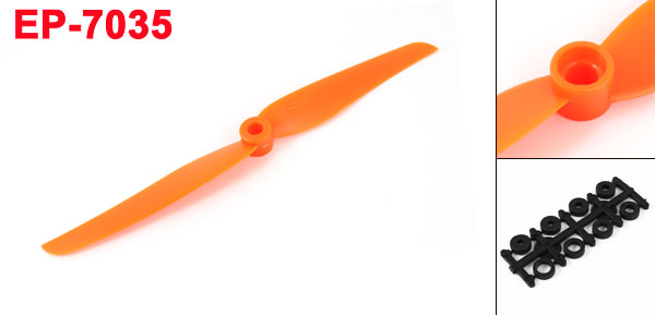 Product Name RC Airplane Propeller Blade Nunber 2 Model EP-7035 Motor Shaft Hole Dia 3mm / 0.12" Total Length(Rotating Diameter) 178mm / 7" Pitch 89mm / 3.5" Max Thickness 9mm / 0.35" Material Plastic Color Orange Net Weight 15g Package Content 1 x Propeller