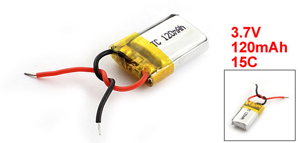Net Weight 4g Rate Discharge 15C Country of Manufacture CHINA Package Content 1 x Lipo Battery Voltage 3.7V Material Li-Poly Total Size 23 x 15 x 6mm/0.91"x 0.6" x 0.24"(L*W*T) Wire Length 35mm/1.3" Capacity 120mAh - Reviews