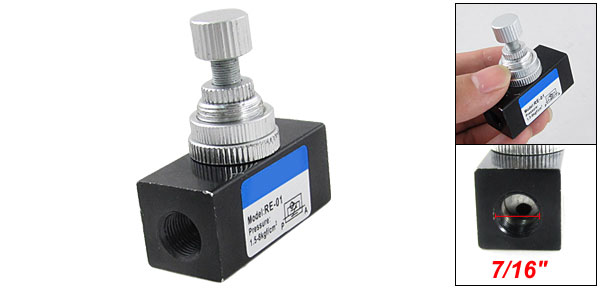 Product Name Flow Control Valve Model RE-01 Flow Direction One-Way Restrictive Valve Working medium Air Joint Pipe Bore Size G1/8'' Female Thread Dia 10mm/7/16" Working pressure 1.5~8kgf/cm2 Working temperature 0~60 oC Overall Size 4.3 x 1.9 x 4.7cm/1.7" x 0.75" x 1.85"(L*W*H) Material Metal Main Color Black Net Weight 56g Package Content 1 x Flow Control Valve - Reviews
