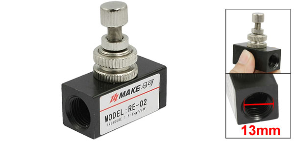 Product Name Flow Control Valve Model RE-02 Flow Direction One-Way Restrictive Valve Working medium Air Joint Pipe Bore Size G1/4" Female Thread Dia. 13mm Working pressure 1.5~8kgf/cm2 Working temperature 0~60 C Overall Size 42 x 19 x 50mm/ 1.7" x 0.75" x 2" (L*W*H) Material Metal Main Color Black Net Weight 69g Package Content 1 x Flow Control Valve - Reviews