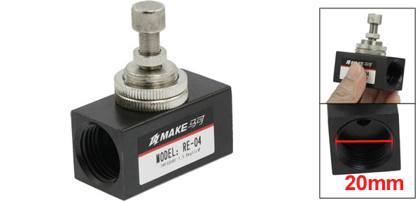 Product Name Flow Control Valve Model RE-04 Flow Direction One-Way Restrictive Valve Working medium Air Joint Pipe Bore Size G1/2" Female Thread Dia. 20mm Working pressure 1.5~8kgf/cm2 Working temperature 0~60 C Overall Size 50 x 25 x 55mm/ 2" x 1" x 2.2" (L*W*H) Material Metal Main Color Black Net Weight 120g Package Content 1 x Flow Control Valve - Reviews