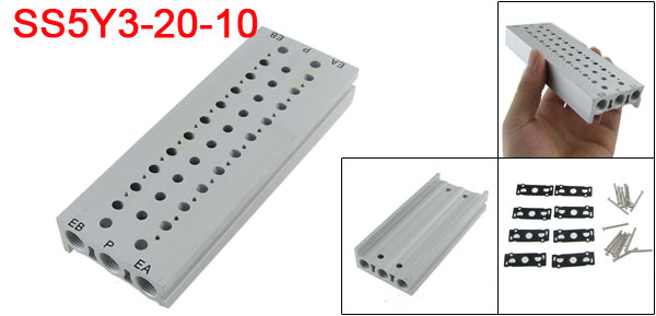 Product Name Solenoid Valve Base Model No. SS5Y3-20-10 Stations 10 Nominal Bore Diameter 4mm / 0.157" P, EA, EB Port Diameter 1/8 PT Mounting Hole Diameter 4.5mm / 0.177" Mounting Hole Distance 114.5 x 16mm / 4.5" x 0.63"(L*W, Center Point to Center Point) Overall Size(Approx.) 132.5 x 49 x 20mm / 5.2" x 1.9" x 0.8"(L*W*T)Material Aluminum Weight 175g Package Content 1 x Solenoid Valve Base