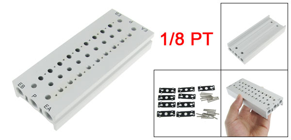 Product Name Solenoid Valve Base Model No. SS5Y3-20-9 Stations 9 Nominal Bore Diameter 4mm / 0.157" P, EA, EB Port Diameter 1/8 PT Mounting Hole Diameter 4.5mm / 0.177" Mounting Hole Distance 104 x 16mm / 4.09" x 0.63"(L*W, Center Point to Center Point) Overall Size(Approx.) 122 x 49 x 20mm / 4.8" x 1.9" x 0.8"(L*W*T)Material Aluminum Weight 162g Package Content 1 x Solenoid Valve Base