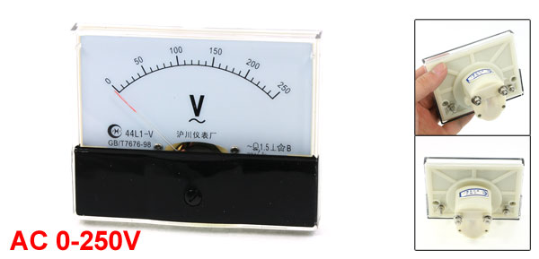 Product Name Analog Voltmeter Model 44L1-V Measuring Voltage Range AC 0-250V Accuracy Class 1.5 Meter Face Size(Approx) 100 x 80 x 12mm/4" x 3.1" x 0.5"(L*W*T) Thread Diameter 3mm/0.1", 4.8mm/0.2" Depth 35mm/1.4" Color Clear, Black Net Weight 131g Package Content 1 x Analog Voltmeter