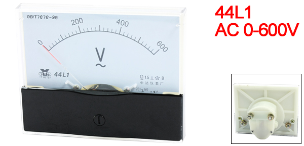 Product Name Analog Voltmeter Type 44L1 Measuring Current Range AC 0-600V Accuracy 1.5 Operating Temperature -20 ~ 40 °C Insulation Force AC 2KV, 50Hz Panel Size(Approx) 100 x 80 x 12mm / 3.9" x 3.1" x 0.47"(L*W*T) Thread Size Long One: 4 x 11mm / 0.16" x 0.43"(D*L)