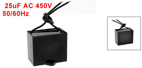 DetailsRectangle Non Polar AC Motor Run Capacitor 25uF 450V CBB61  Product Name Motor Capacitor Model CBB61 External Material Plastic Dielectric Material Metalized Polypropylene Film Rated Capacitance 25uF Tolerance ±5% Rated Frequency 50/60Hz Rated Voltage AC 450V Body Size 58 x 32 x 49mm/ 2..3" x 1.26" x 1.9"(L*W*T) Fixing Hole Diameter 5mm/0.197" Cable Length 12cm/4.7" Net Weight 76g Package Content 1 x Motor Run Capacitor
