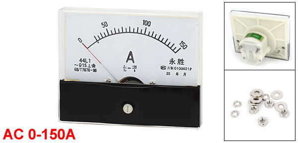 DetailsRectangle Panel AC 150A Ammeter Analog Meter 44L1-A  Product Name Analog Ammeter Model 44L1 Type AC Accuracy Class 1.5 Measuring Current Range AC 0-150A Total Size 9.8 x 7.8 x 6.5cm/3.9" x 3.1" x 2.6" (L*W*H) Base Size(Not Included Screw) 4.9 x 3.6 x 3.3cm/1.9" x 1.4" x 1.3" (L*W*H) Thread Dia. 0.4cm/0.16" Material Pllastic Color Black, Clear Net Weight 148g Package Content 1 x AC Analog Ammeter 1 Pack x Installing Parts