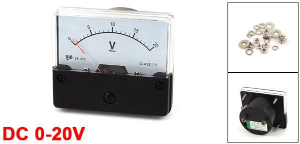 Product Name Analog Voltmeter Measuring Current Range DC 0-20V Accuracy 2.5 Panel Size(Approx) 70 x 60 x 12mm/2.8" x 2.4" x 0.47"(L*W*T) Thread Size Big One: 4 x 7mm / 0.25" x 0.3"(D*L)