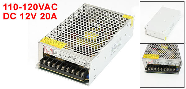 Item Name Switching Power Supply Model No. HX-250A-12 Power Type Constant Voltage Input 110-120VAC Output DC 12V 20A Power 240W Switch Voltage & Frequency 200-240VAC 50/60Hz Size 20 x 11 x 5cm / 7.9" x 4.3" x 2" (L*W*H) Case Material Metal, Aluminum Alloy Main Color Silver Tone Net Weight 674g Package Content 1 x Switching Power Supply - Reviews