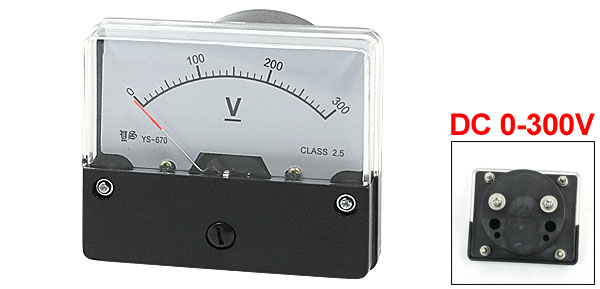 Product Name Analog Voltmeter Model YS-670 Measuring Current Range DC 0-300V Accuracy Class 2.5 Total Size 7 x 6 x 5.3cm/2.8" x 2.4" x 2.1"(L*W*T) Color Clear, Black, White Weight 106g Package Content 1 x Analog Voltmeter