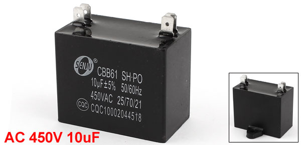 Product Name Motor Run Capacitor Model CBB61 For Air Conditioner, Ceiling Fan Capacitance 10uF Tolerance ±5% Rated Voltage AC 450V Temperature Coefficient 25/70/21 Frequency 50/60Hz Pin Count 4 Pin Spacing(Approx.) 10 x 6mm/0.4" x 0.24"(L*W) Overall Size 4.8 x 3.9 x 4cm/1.9" x 1.5" x 1.6"(L*W*H) Screw Hole Dia 5mm/0.2" Main Material Polypropylene Film Color Black Weight 63g