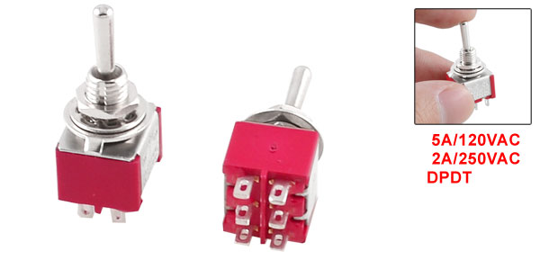 DetailsRed 5A/120VAC 2A/250VAC Toggle Switches 3 Position DPDT 2 Pcs  Product Name Toggle Switch Rated Voltage & Current AC 250V, 2A AC 120V, 5A Position 3 Positions(ON-OFF-ON) Type DPDT Mounting Hole Diameter 2mm / 0.08" Body Size(Approx.) 12 x 13 x 11mm / 0.47" x 0.5" x 0.43"(L*W*T) Total Height 32mm / 1.3" Main Material Plastic, Metal Main Color Silver Tone, Red Weight 13g Package Content 2 x Toggle Switch