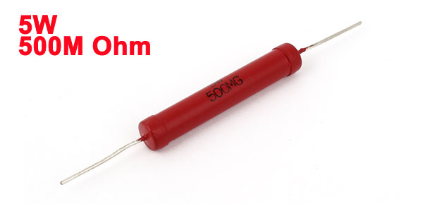 DetailsRed Bar High Voltage Glass Glaze Film Resistor 2% 5W 500M Ohm  Product Name High Voltage Resistor Resistance Value 500M Ohm Power Rating 5W Resistance Tolerance ± 2% (G) Body Size 50 x 8mm / 2" x 0.3" (L*D) Lead Length 25mm / 1" External Material Glass Glaze, Metal Color Red, Silver Tone Weight 10g Package Content 1 x High Voltage Resistor