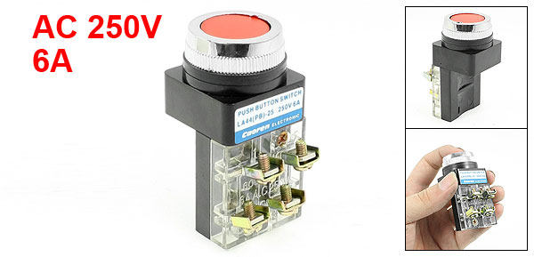 Product Name Push Button Switch Contact Type 1NO, 1NC Working Voltage & Electricity AC 250V, 6A Max Voltage 600V Terminal Quantity 4 Panel Cutout Diameter 24mm / 0.94" Fit Panel Max. Thickness 6mm / 0.24" Total Size(Approx) 6.5 x 3.3 x 4cm / 2.6" x 1.3" x 1.6" (L*W*H) External Material Plastic, Electric Parts Color Black, Red Net Weight 45g Package Content 1 x Push Button Switch - Reviews