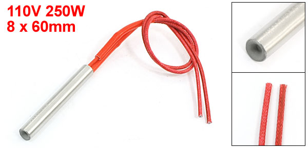 Product Name Cartridge Heater Material Stainless Steel, PVC, Nylon Rated Voltage 110V Power 250W Heater Size (Approx.) 8 x 60mm / 0.31" x 2.4"(D * L ) Wire Length(Approx.) 26.5cm / 10.4" Color Silver Tone, Red Weight 23g Package Content 1 x Cartridge Heater - Reviews