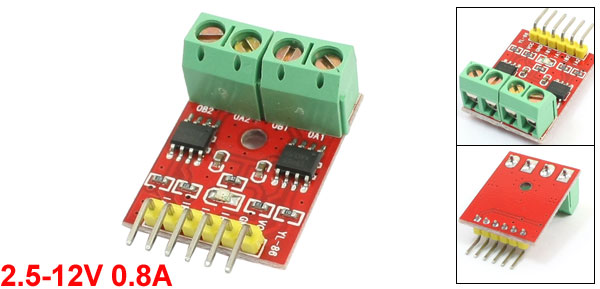 Product Name Motor Driver Module Chip Model L9110 Supply Voltage 2.5-12V Operating Current(Max.) 0.8A Total Size 33 x 22 x 14 mm / 1.3" x 0.87" x 0.55" (L*W*H) Mounting Hole Dia. 3mm/ 0.12" Material Plastic, Iron, PCB Color Green, Red, Yellow Weight 7g Package Content 1 x Motor Driver Module - Reviews