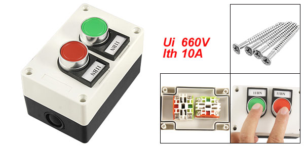 Product Name Push Button Station Ui 660V Ith 10A IEC 337 Material Plastic, Metal Overall Size(not include the button) 10.8 x 7 x 6.3cm/4.2'' x 2.7'' x 2.5'' (L*W*H) Overall Height 7.9cm / 3.1" Color As Picture Shown Net Weight 206g Package Content 1 x Push Button Station - Reviews