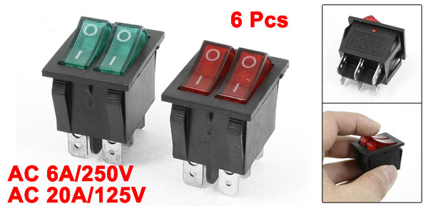 Terminals 6 Pins Position On-Off Lamp Color Red, Green Rated Voltage AC 6A/250V, AC 20A/125V Overall Size 23 x 20 x 27mm / 0.9" x 0.8" x 1.1" (L*W*H) Mounting Size 21 x 18mm / 0.83" x 0.71" (L*W) Color Black, Red, Green Material Plastic, Metal Total Weight 86g Package Content 6 x Rocker Switch - Reviews