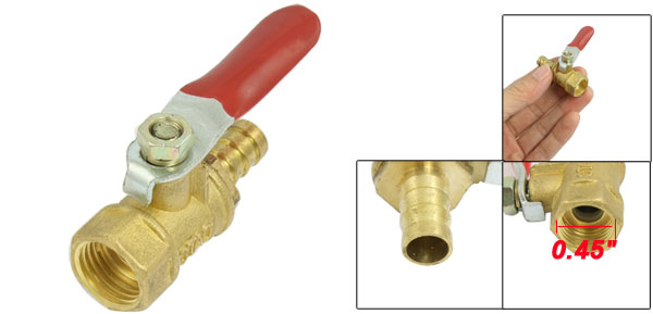 Product Name Ball Valve Thread Inner Diameter 11.5mm/ 0.45" Ball Hole Diameter 6mm/ 0.24" Hose Tail OD 8mm/ 0.31" Hose Tail Inside Diameter 6.5mm / 0.26" Level Handle Size 45 x 11mm/ 1.77" x 0.43" (L*W) Overall Size 55 x 15 x 27mm/ 2.2" x 0.59" x 1.1" (L*W*H) Color Gold Tone, Red Material Brass, Metal, Plastic Weight 33g Package 1 x Brass Ball Valve - Reviews
