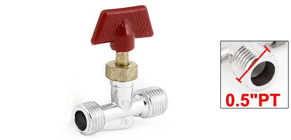 Red Handle Silver Tone Metal T Shape 0.5" PT Male to Male Threaded Gas Valve