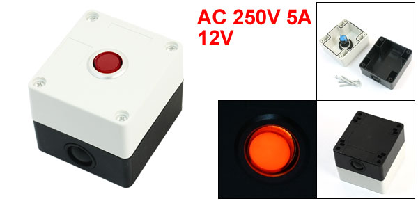 Product Name Push Button Station Action Type Latching Hole Diameter 22mm/ 0.87" Ith 5A/AC 220V Push Button Rating AC 250V 5A Lamp Voltage 12V Lamp Color Red Contact Type SPDT( 1 NO 1 NC) Box Size 78 x 71 x 65mm/3" x 2.8" x 2.5" (L*W*H) Button Dia 16mm/0.6" Mounting Hole Diameter 5mm/ 0.2" Mounting Hole Center Distance 64 x 58mm/2.5" x 1.5"(L*W) External Material Plastic External Color Black, White, Red Net Weight 125g Package Content 1 x Push Button Station