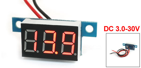 DetailsRed LED Display Panel Meter 2 Wires Digital Voltmeter DC 3.0-30V  Product Name Digital Voltmeter Measuring Voltage Range DC 3.0-30V Display Color Red Overall Size (Approx) 3.5 x 1.4 x 0.8cm/1.4" x 0.55" x 0.315"(L*W*T) Wire Lenght 19cm/ 7.5" Color As Picture Show Net Weight 6g Package Content 1 x Digital Voltmeter