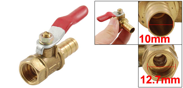 Product Name Ball Valve Thread Inner Diameter 1/4" PT (12.7mm) Hose Connector 10mm/ 2/5" Lever Handle Size 45x 11mm/ 1.77" x 0.4" (L*W) Overall Size 56 x 17 x 33mm/ 2.2" x 0.7" x 1.3" (L*W*H) Color Gold Tone, Siver Tone & Red Material Plastic, Solid Brass Weight 35.4g Package 1 x Brass Ball Valve - Reviews