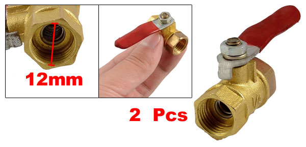 Product Name Ball Valve Inlet Outside Dia 12mm/ 0.47" Outlet Outside Dia 12mm/ 0.47" Level Handle Size 49 x 11mm/ 1.9" x 0.43" (L*W) Total Size 57 x 16 x 29mm/ 2.2" x 0.64" x 1.2" (L*W*H) Color Gold Tone & Red & Silver Tone Material Solid Brass Weight 62g Package 2 x Ball Valve - Reviews