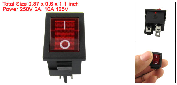 Product Name Rocker Switch Color Black, Red Material Plastic, Electrical Part Type KCD1 Single Throw Double Pole DPST Indicator Type Red Neon Power 250V 6A, 10A 125V Withband Voltage ≥1500V/Min Insulance ≥1000MΩ Contact Resisitance ≤50MΩ Max Press Number 10000 Total Size 22 x 14 x 28mm / 0.87 x 0.6 x 1.1 inch(L*W*H) Mount Hole Size 18 x 13mm / 0.71" x 0.5"(L*W) Distance of Each Pin 6.56mm Net Weight 5.2g Package Content 1 x Rocker Switch - Reviews
