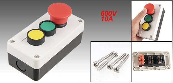Product Name Push Button Station Action Type Momentary Contact Type NC(Mushroom), NO(Flat Push Button) Ui 600V Ith 10A Material Plastic, Metal Button Diameter(Approx.) 2.5cm/ 1" Overall Size(not include the button) 13.2 x 6.7 x 7.8cm/ 5.2" x 2.6" x 3" (L*W*H)