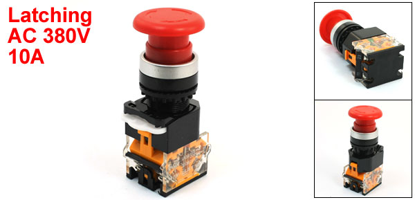 DetailsRed Mushroom Head DPST Latching Emergency Stop Push Button Switch 380VAC 10A  Item Name Push Button Switch Contact Type Latching DPST Ui 380VAC Ith 10A Button Color Red Mounting Thread Diameter 22mm / 0.87" Button Cap Dia 35mm /1.4" Terminals Number 4 Overall Size 8.8 x 4 x 3.5cm/3.4" x 1.6" x 1.4"(L*W*H) Material Plastic, Electronic Parts Weight 56g Package Content 1 Pcs x Push Button Switch