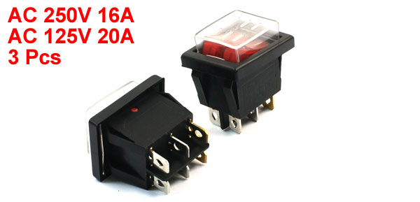 Product Name Rocker Switch Action Dual SPST Terminals 6 Pin (ON-OFF) Position Number 2 Light Color Red Rating Voltage 16A 250VAC 20A 125VAC Total Size 3.6 x 2.8 x 4cm/1.4" x 1.1" x 1.6"(L* W *T) Mounting Dimension 3 x 2.1cm/1.2" x 0.8"(L*W) Color Black, Clear, Silver Tone Material Plastic, Rubber, Metal Total Weight 53g Package Content 3 x Rocker Switch w Cover - Reviews