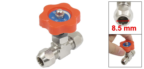 Product Name Stop Valve Outlet Inlet Diameter 8.5mm/ 0.33" Male Thread Diameter 12mm/ 0.47" Handle Diameter 35mm/ 1.4" Overall Size 45 x 35 x 48mm/ 1.8" x 1.4' x 1.9" (L*W*T) Material Metal Color Silver Tone & Red Weight 53g Package Content 1 x Stop Valve - Reviews
