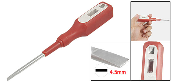 Product Name Electroprobe Material Plastic, Metal Design Slotted Screwdriver Working Voltage AC 80-500V Color Red, White, Silver Tone Slotted Tip Width 4.5mm / 0.18" Handle Size 114 x 22mm / 4.5" x 0.9"(L*T) Total Length(Approx.) 168mm / 6.6" Weight 40g Package Content 1 x Slotted Screwdriver Electroprobe - Reviews