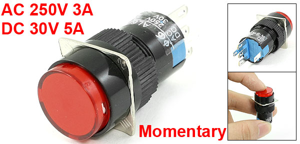 Product Name Push Button Switch Action Type Momentary Contact Type 1NO, 1NC, SPDT Light Voltage AC 220V Rating Voltage AC 250V 3A DC 30V 5A Light Color Green Shell Color Black, Red Terminals Quantity 5 Pins Mounting Hole Diameter 16mm / 0.63" Overall Size (Approx) 17 x 17 x 40mm / 0.67" x 0.67" x 1.57" (L*W*T) Weight 8g Package Content 1 x Push Button Switch - Reviews