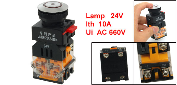 Product Name Push Button Switch Model No. LA160-22A2-11DN Contact Type 1 NO(Normally Open) + 1 NC(Normally Close) Action Type Momentary Ith 10A Ui AC 660V Lamp Voltage 24V Panel Cutout Diameter 2.2cm / 0.87"(7/8") Fit Panel Thickness(Adjustable) Max 0.8cm / 0.3" Button Diameter 1.8cm / 0.7" Total Size 3.6 x 2.9 x 7.6cm / 1.4'' x 1.1'' x 3'' (L*W*H) Main Material Plastic, Metal Main Color Push Button: Red, Silver Tone Body: Black, Orange, Red Weight 64g Package Content 1 x Push Button Switch - Reviews