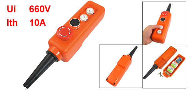 Product Name Hoist Pushbutton Switch Model No. COB COJ2146 Contact Type Momentary Emergency Stop Contact Type Self Locking IEC 337 Ui 660V Ith 10A Push Buttons Black Push Button, Emergency Stop(red),Up, Down Main Body Size 20 x 5.8 x 6.5cm / 7.9" x 2.3" x 2.6"(L*W*H) Insulating Tube Length 10.2cm / 4" Fit Cable Diameter 1.1cm / 0.43" External Material Plastic, Rubber Color Orange Red, Black Net Weight 348g Package Content 1 x Hoist Pushbutton Switch - Reviews