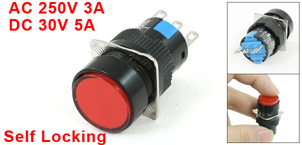 Item Name Push Button Switch Action Type Self Locking Contact Type 1NO 1NC( SPDT) Voltage Curent AC 250V 3A, DC 30V 5A Button Diameter 15mm/0.63" Mounting Thread Diameter 16mm / 0.63" Size 17 x 17 x 40mm / 0.67" x 0.67" x 1.57" (L*W*T) Color Red, Black Material Plastic, Metal Net Weight 7g Package Content 1 x Push Button Switch - Reviews
