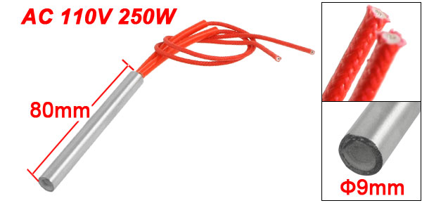 Product Name Cartridge Heater Material Stainless Steel, PVC, Nylon Rated Voltage AC 110V Power 250W Heater Size (Approx.) 9 x 80mm/ 0.35“ x 3.1” (D * L) Wire Length (Approx.) 26cm/ 10.2" Color Red, Silver Tone Weight 30g Package Content 1 x Cartridge Heater - Reviews