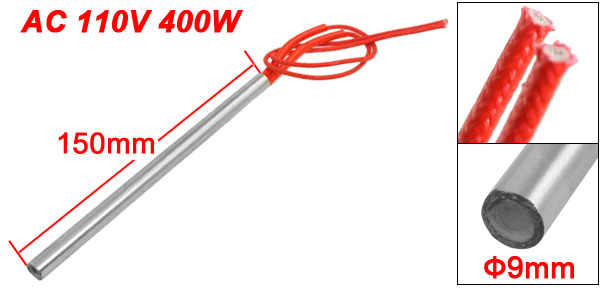 Product Name Cartridge Heater Material Stainless Steel, PVC, Nylon Rated Voltage AC 110V Power 400W Heater Size (Approx.) 9 x 150mm/ 0.35" x 5.9"(D * L) Wire Length (Approx.) 26cm/ 10.2" Color Red, Silver Tone Weight 50g Package Content 1 x Cartridge Heater - Reviews